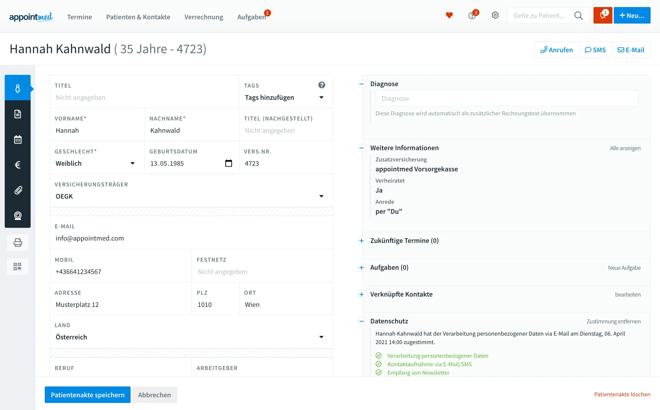 appointmed verfügt über eine umfassende digitale Patientenakte, in der alle relevanten Informationen strukturiert und sicher gespeichert werden. Dazu gehören Stammdaten, Diagnosen, Rezepte, Dokumente, Behandlungsnotizen und Rechnungen.