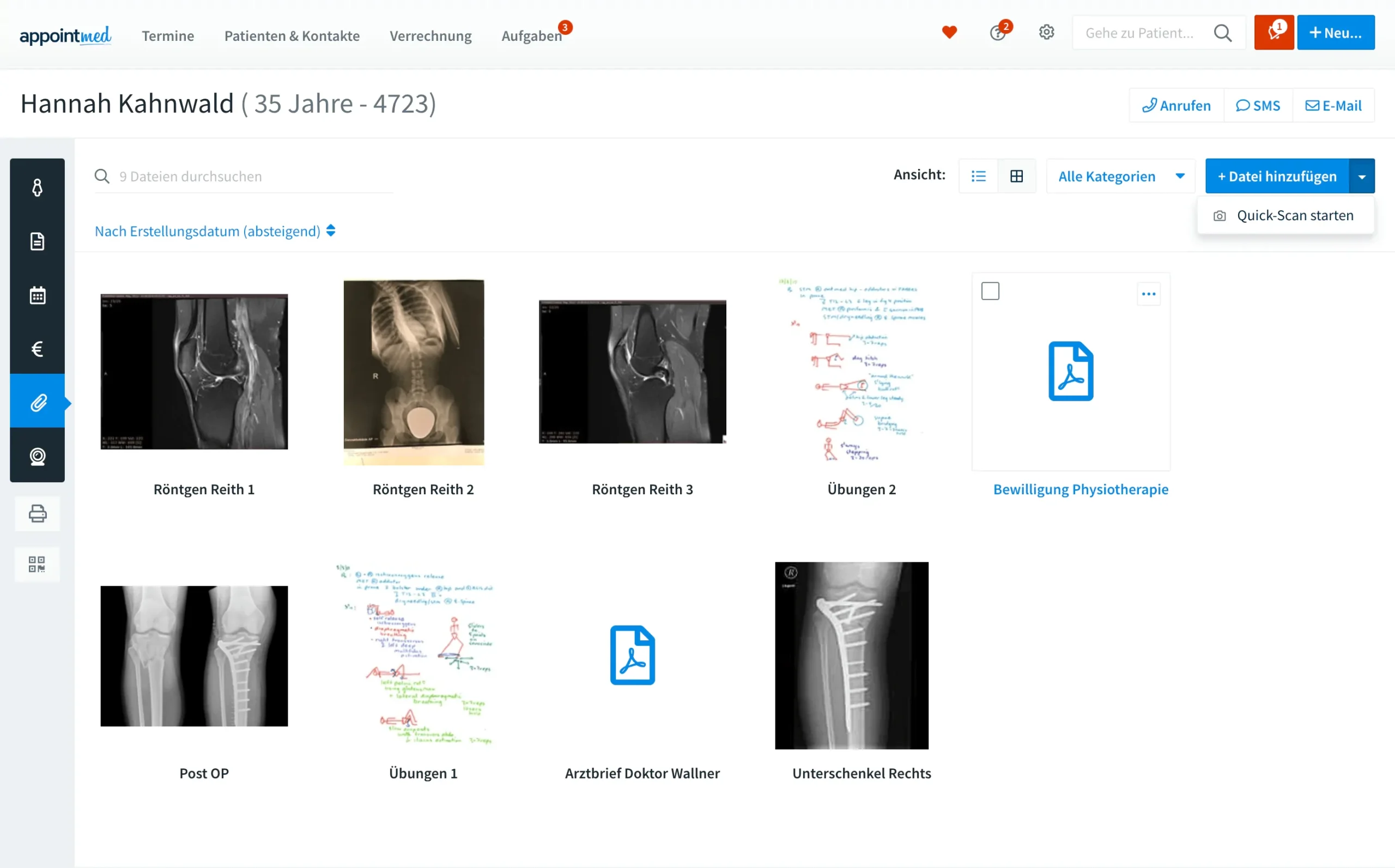 Ergotherapeut:innen können beliebige Dateien (z. B. Befunde, Röntgenbilder, Fotos oder Videos) hochladen und direkt mit der Patientendatei verknüpfen. So sind alle Unterlagen zentral verfügbar – ohne Papierchaos.