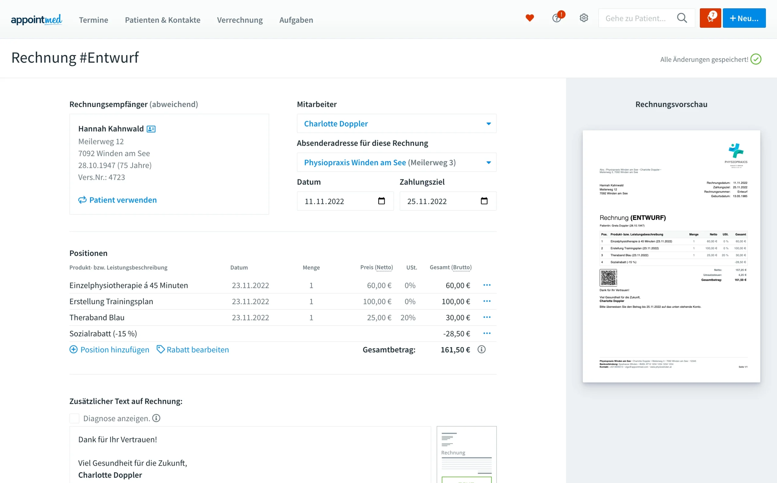 appointmed unterstützt Rechnungsstellung für Privat-/Selbstzahler sowie Exporte für Abrechnungsstellen; eine direkte, vollständige Kassen-/Kassenärztliche Abrechnung ist derzeit nicht Standard.